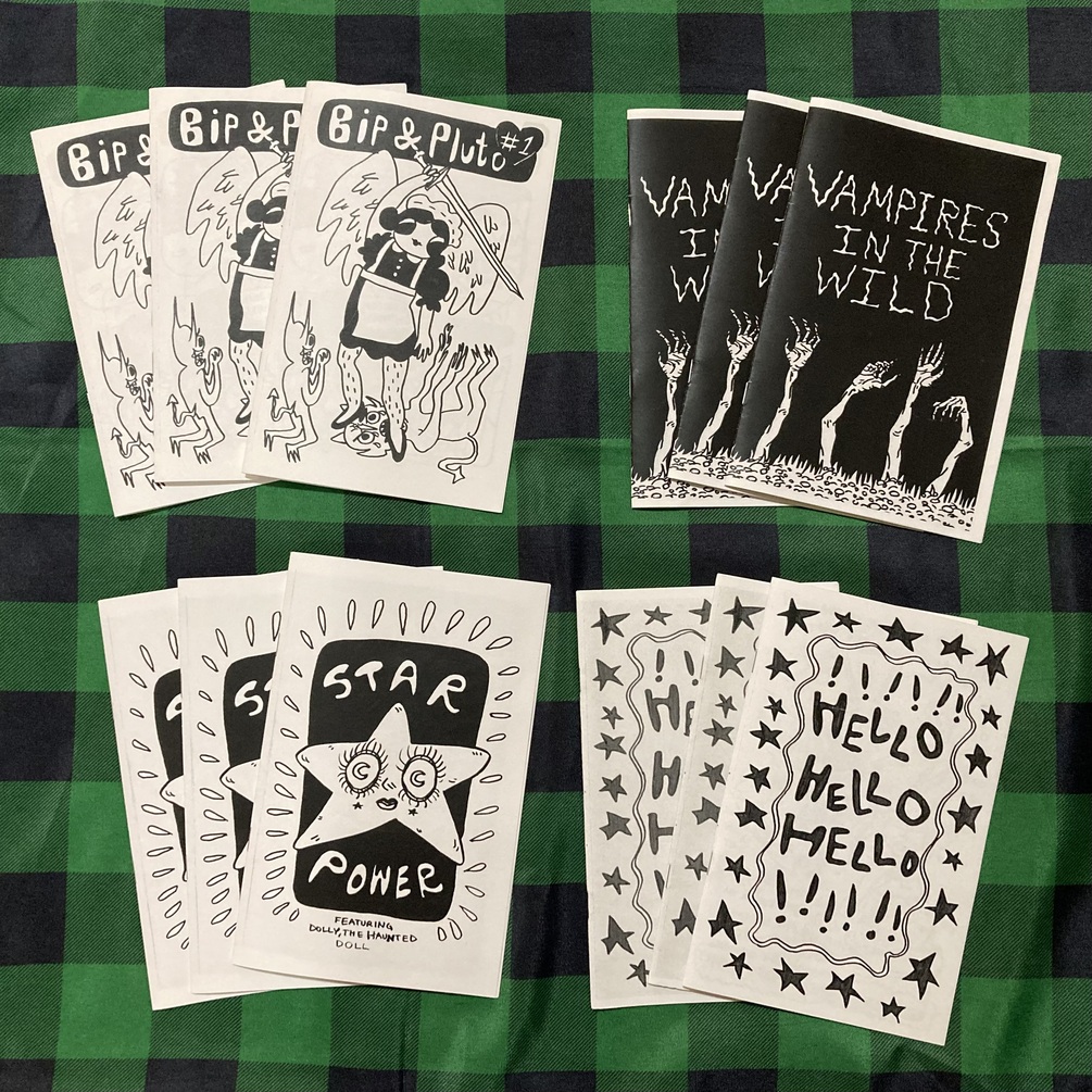 1 copy of each zine: Hello Hello Hello, Vampires in the Wild, Bip & Pluto #1, and Star Power