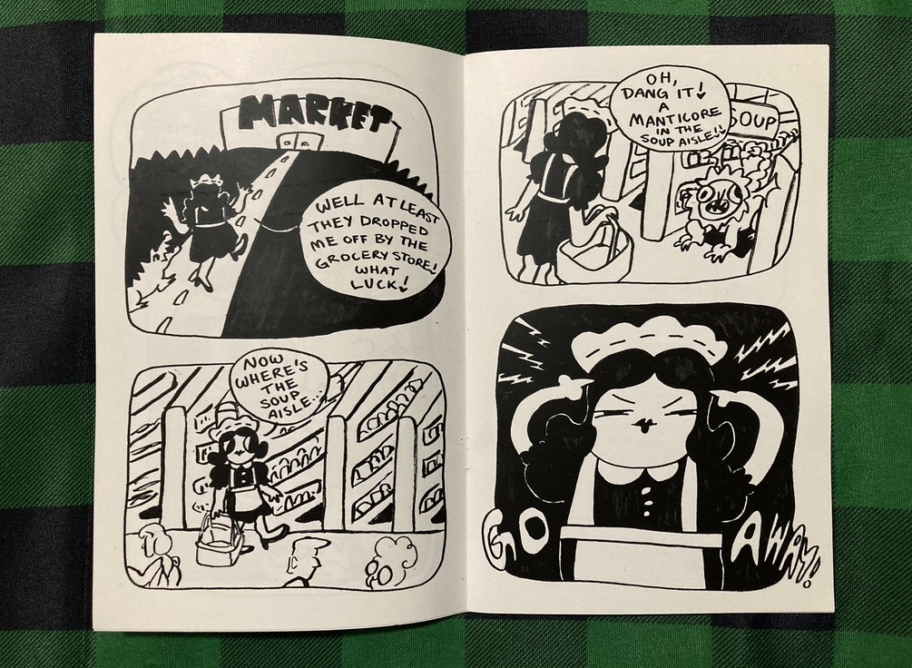 14-page comic zine about a maid named bip and her invisible pet alligator named pluto. she makes a trip to the grocery store. hijinks ensue.